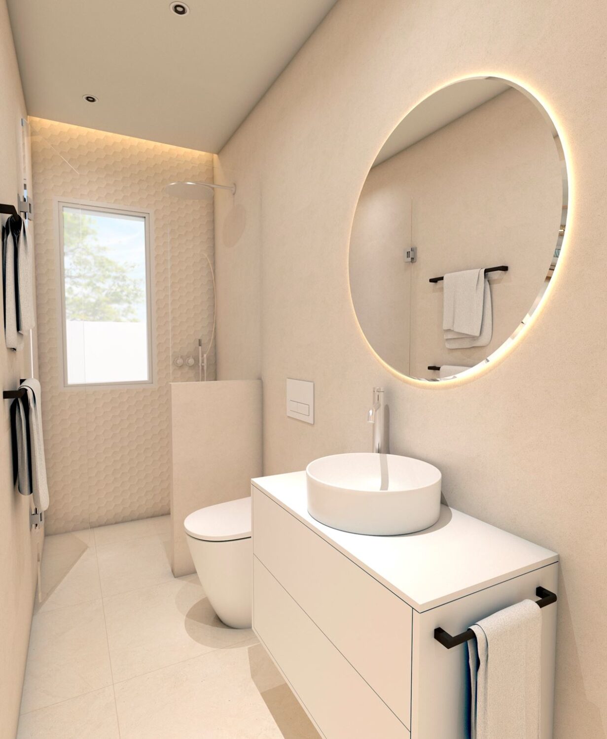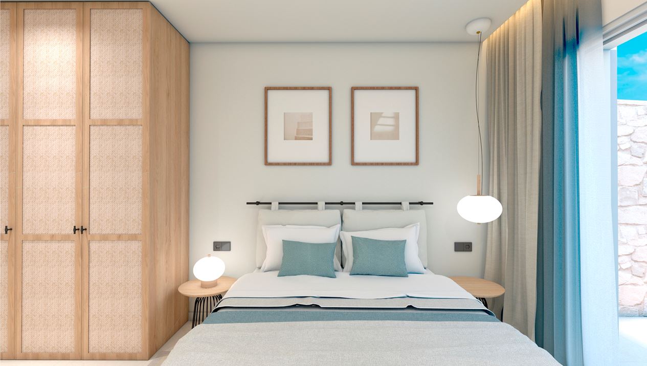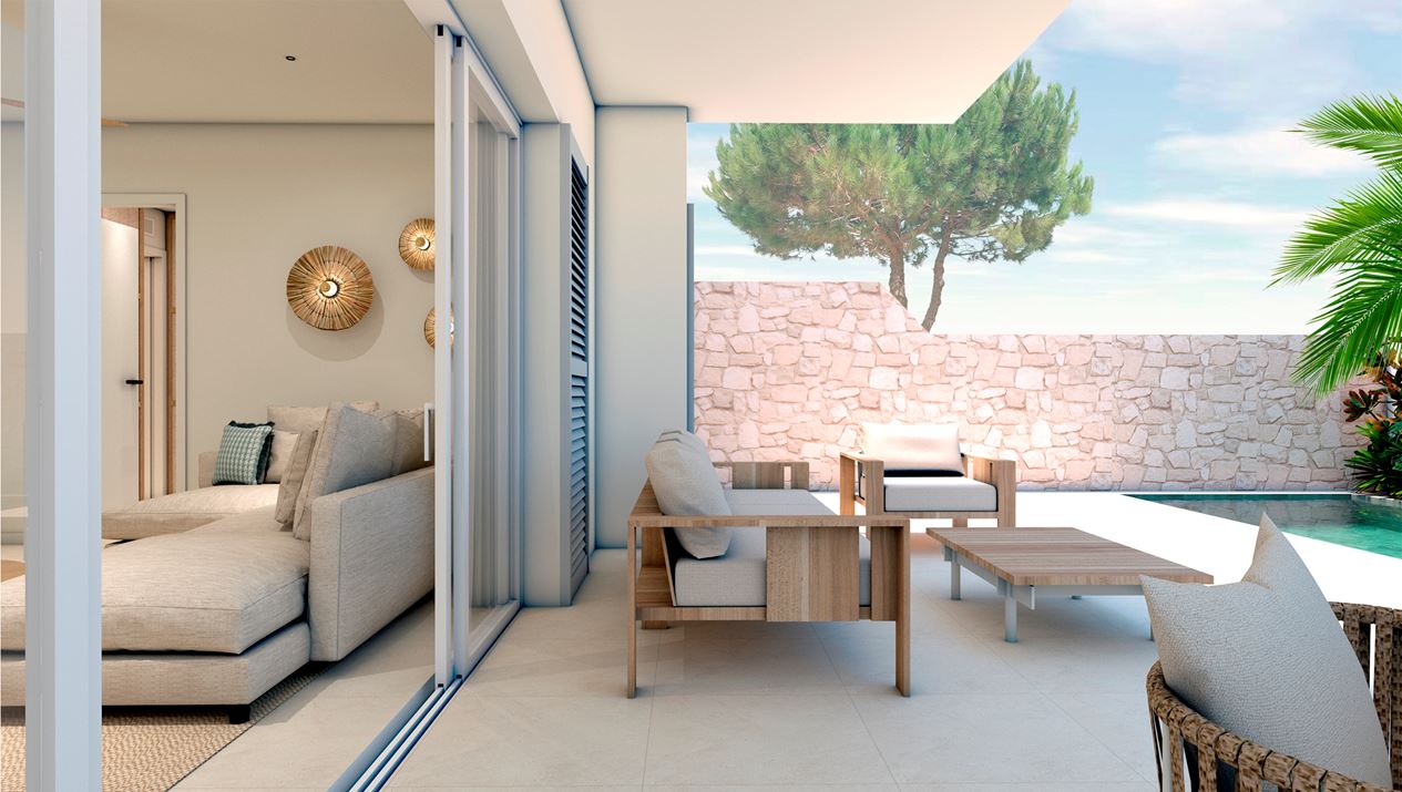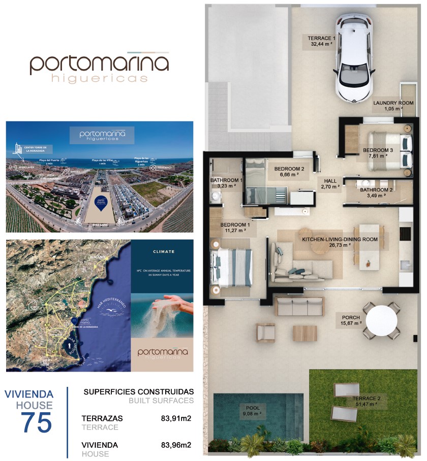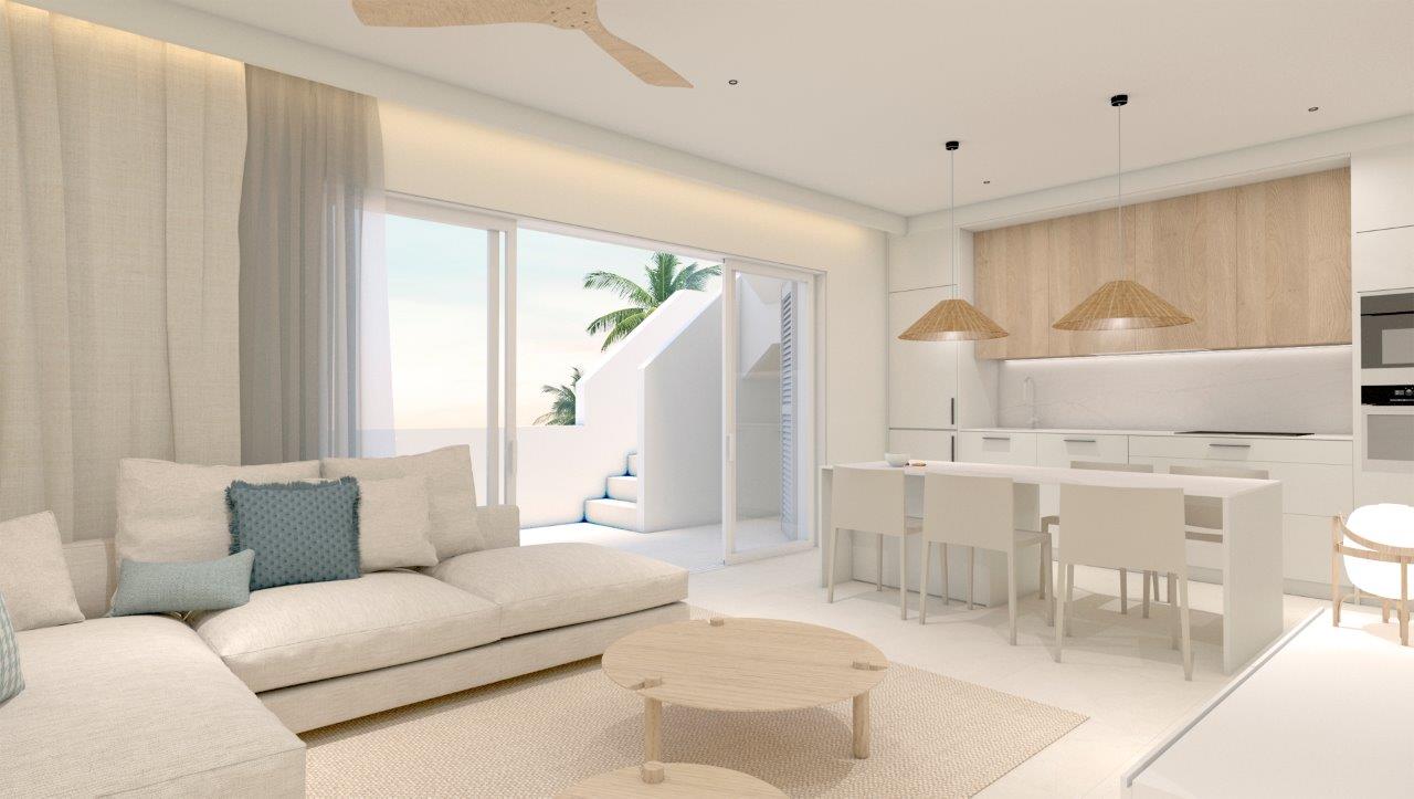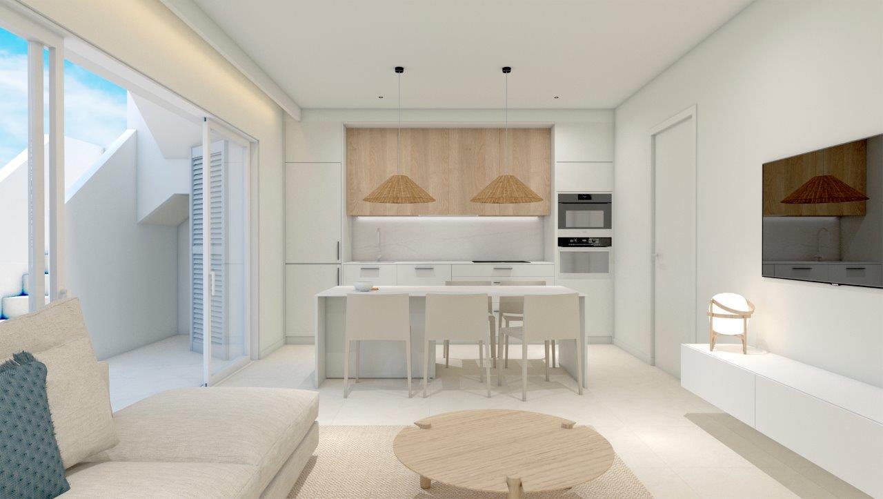 Newly built ground floor apartments with 3 bedrooms, and 2 bathrooms, located 450 meters from the beach in Torre de la Horadada/ Higuericas. Pre-installation of air conditioning system by air ducts. Floor heating in the bathroom, living room, and kitchen. Furnished kitchen. Choice of two colors. White goods. Fridge, oven, microwave, induction hob, extractor, and washing machine included. Bathroom taps and thermostatic shower with adjustable barands showerhead. Rocawall-hung sanitaryware in white, Duplomodel, withsoft-closelid. Bathroom vanities and mirrors with LED lighting. Aluminum Mallorquinas(louvre shutters) are used in exterior carpentry. Climalit type double glazing and airchamber, with low emissivity glass in south-facing windows.Metal carpentry with thermal bridge break.Indoor and outdoor LED lighting. Electricity. Jung–LS990 lightswitches, in black or similar.TV, phone, and optical fiber installations. Reinforced front door with five lock points and crowbar-proof system.Interior woodwork.White interior doors and fitted wardrobes, with doors in raffia and Pacific walnut melamine or similar.Tiling.Porcelain floor tiles.High-quality wall tiles. Stone water races are waterproofed with asphalt roofing felt and non-slip porcelain exterior floor tiles. Doubleperimeterwalls. Special acoustic brick, low conductivity EPS Grafipol, and honeycomb brick.Shallow foundation or reinforced concreteslabsHA–25/IA, with steel reinforcement B-500S.The bathroom’s shower screens are included.Paintwork.Painted white smooth walls. Odorless, ecological, and hypoallergenic.Installation of an aerothermal system for DHW(domestic hot water).Efficient energy use certificate level A. Kitchenette in solarium, shower on terrace. Private pool in all properties. Prices from 365.000€. Ready in 2026.