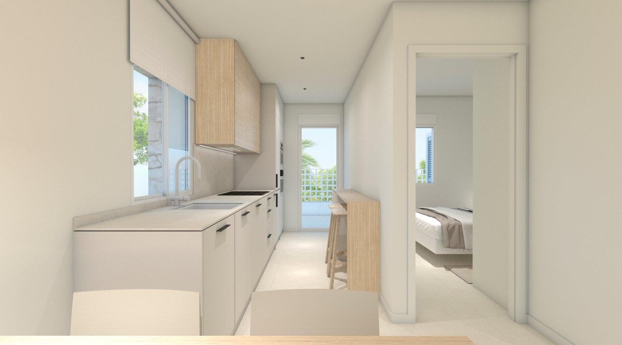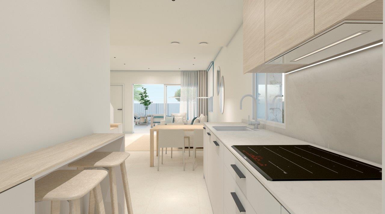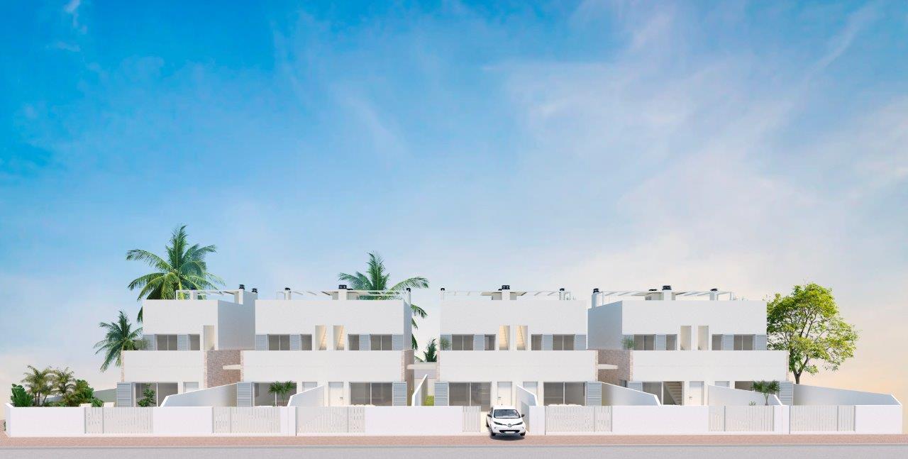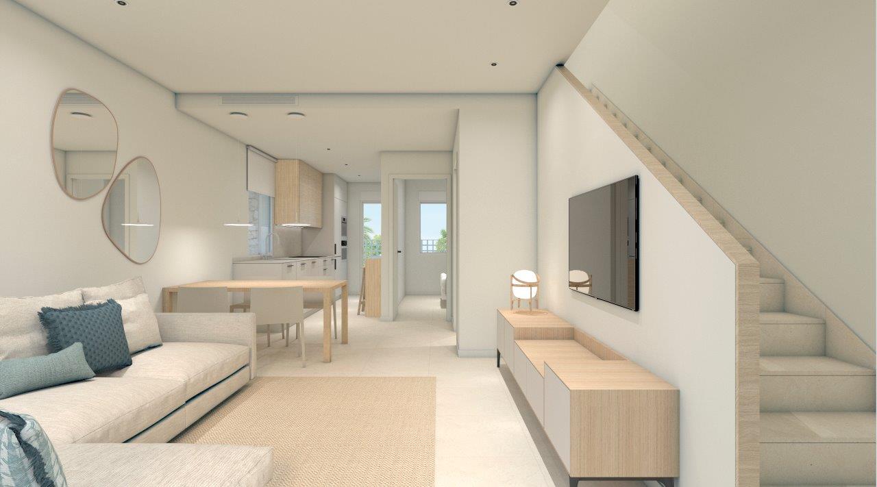 Newly built townhouses with 3 bedrooms, and 2 bathrooms, located 450 meters from the beach in Torre de la Horadada/ Higuericas. Pre-installation of air conditioning system by air ducts. Floor heating in the bathroom, living room, and kitchen. Furnished kitchen. Choice of two colors. White goods. Fridge, oven, microwave, induction hob, extractor, and washing machine included. Bathroom taps and thermostatic shower with adjustable barands showerhead. Rocawall-hung sanitaryware in white, Duplomodel, withsoft-closelid. Bathroom vanities and mirrors with LED lighting. Aluminum Mallorquinas(louvre shutters) are used in exterior carpentry. Climalit type double glazing and airchamber, with low emissivity glass in south-facing windows.Metal carpentry with thermal bridge break.Indoor and outdoor LED lighting. Electricity. Jung–LS990 lightswitches, in black or similar.TV, phone, and optical fiber installations. Reinforced front door with five lock points and crowbar-proof system.Interior woodwork.White interior doors and fitted wardrobes, with doors in raffia and Pacific walnut melamine or similar.Tiling.Porcelain floor tiles.High-quality wall tiles. Stone water races are waterproofed with asphalt roofing felt and non-slip porcelain exterior floor tiles. Doubleperimeterwalls. Special acoustic brick, low conductivity EPS Grafipol, and honeycomb brick.Shallow foundation or reinforced concreteslabsHA–25/IA, with steel reinforcement B-500S.The bathroom’s shower screens are included.Paintwork.Painted white smooth walls. Odorless, ecological, and hypoallergenic.Installation of an aerothermal system for DHW(domestic hot water).Efficient energy use certificate level A. Kitchenette in solarium, shower on terrace. Private pool in all properties. Prices from 492.000€. Ready in 2025.